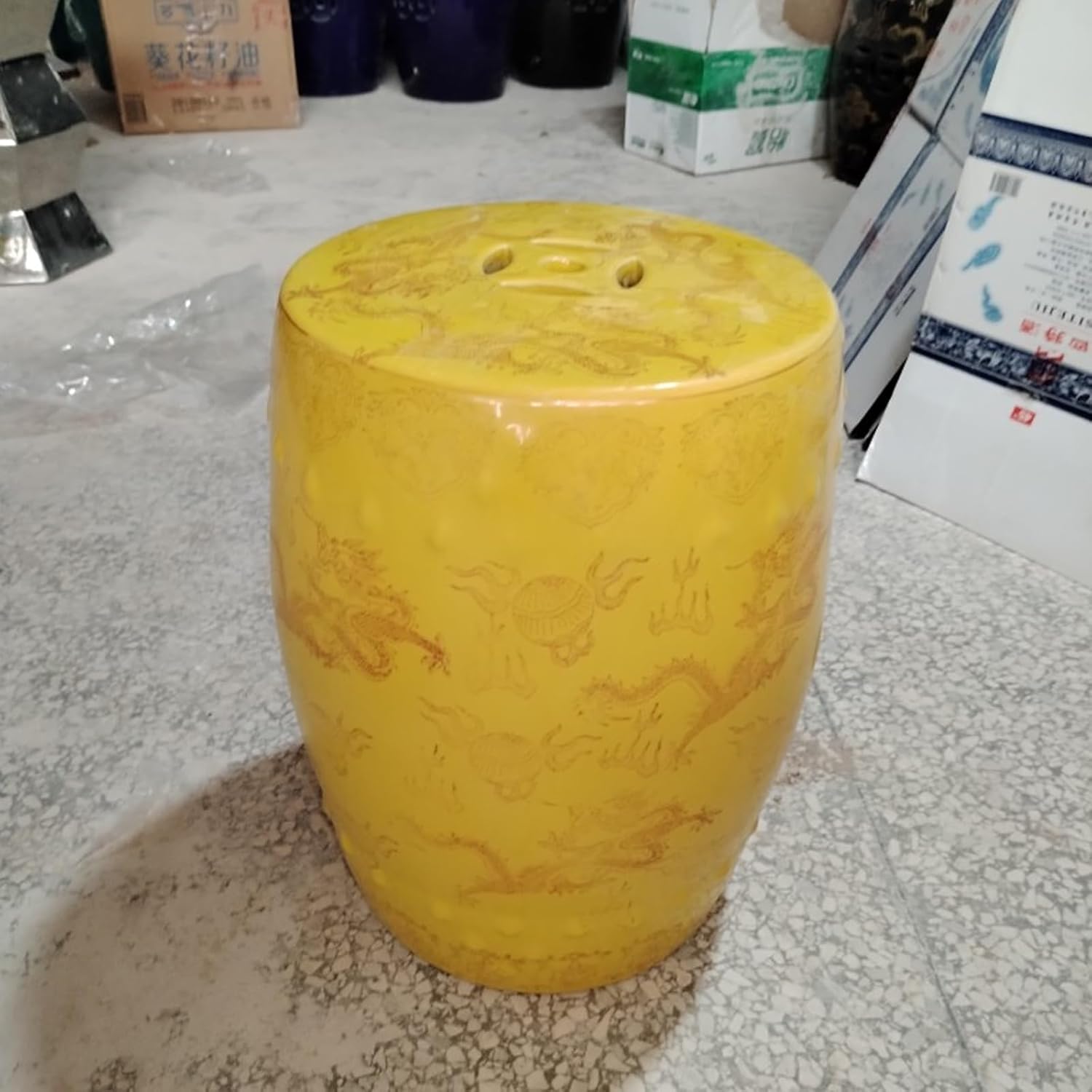 This blue and white porcelain dressing stool is inspired by the traditional drum shape, which cleverly combines the rounded and full outline with the blue and white porcelain This Jingdezhen new Chinese ceramic drum stool is fired at a high temperature of 1300℃. The glaze color blends with the porcelain body and will not fade over time. It can bear 200-300 pounds and is sturdy and durable. The gold dragon pattern design is suitable for outdoor gardens, living rooms and other scenes. It can be used as a stool or coffee table. The round non-slip base protects the ground, the smooth porcelain surface is not afraid of wind and rain, and it can be washed clean with water. It is beautiful, practical and convenient.Name: Ceramic Drum StoolMaterial: CeramicSize: 33*42 cm/12.9*16.5 inchesOrigin: ChinaPacking List:1 x Ceramic StoolRemarks:1. Due to different monitors and lighting effects, the actual color of the product may be slightly different from the picture.2. Due to manual measurement, please allow a measurement error of 1-3 cm.3. Small black spots and pinholes may appear during the production process, which is normal. If you pursue perfection, please purchase with caution.4. Do not use steel wool or hard objects to scratch when cleaning. Minor scratches caused by using metal cutlery are normal.