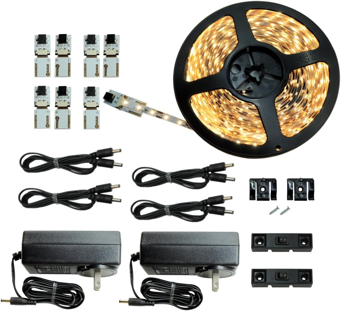 CSA Listed - Meets UL 8750 required by the National Electric Code for home installation. Ask your lighting provider for UL Listed Led Lighting productsOur newly patented solderless Tiger Paw LED Connector makes creating custom LED lighting projects affordable and EASY. What separates this kit from the rest is the ability to create custom length strips with the snap of your fingers. Our solderless Tiger Paw Connectors allow you to take long lengths of LED lights and fit each strip to any application either in the home or on the job site. The ease of installation makes this kit a perfect fit for both beginners, DIYers, and contractors or electricians working in the field. The power supply plugs into any standard outlet. This plug-and-play system makes lighting a breeze and will leave you wanting more! Our Super Bright LED Flex Strips are the perfect choice for: Under or above cabinet lighting Shelves Display cabinets Signage Entertainment centers Cut and Connect Kit, Super Bright Includes: 39.5 Foot Reel of Super Bright LED Flexible Strip Tape in Cool White, with 3M adhesive backing (2) 3.8 Amp Power Supplies (2) On/Off Switches (4) Tiger Paw LED Connector Pairs, detailed instructions included (4) 3 Foot Interconnect Cables (10) Clips and Screws Dimensions: Flexible Strips: 39.5ft x 0.375" x 0.25" ; LED every .625" 3.8 Amp Power Supply: 1.8" x 3.8" x 1.5" body with 6' Cable Switch: 2.5" x 0.75" x 0.5" Tiger Paw LED Connector: 1.76" x 0.66" 3 Foot Cable: 22 AWG with 1.3mmx3.5mm male plug on each end All parts and accessories can be purchased separately - shorter cables, longer cables, custom cables, power supplies, extra lights, connectors, etc.